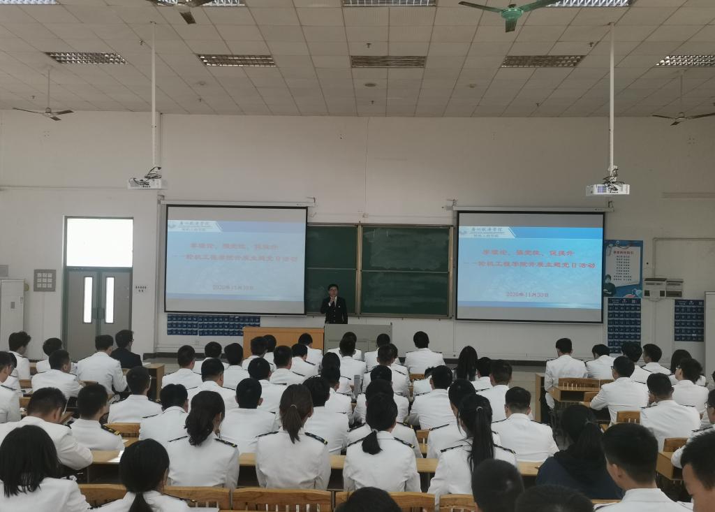 (轮机工程学院供稿)为进一步提高全体党员的思想觉悟和政治理论水平,充分发挥党员先锋模范作用和党支部战斗堡垒作用,11月30日中午,轮机工程学院两个学生党支部在教学楼111开展“学理论、强党性、促提升”主题党日活动。会议由学院学生第一党支部书记郭世俊老师主持,全体学生党员、预备党员和入党积极分子近200人参加了会议。