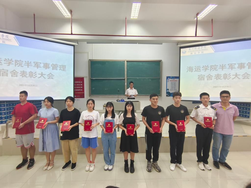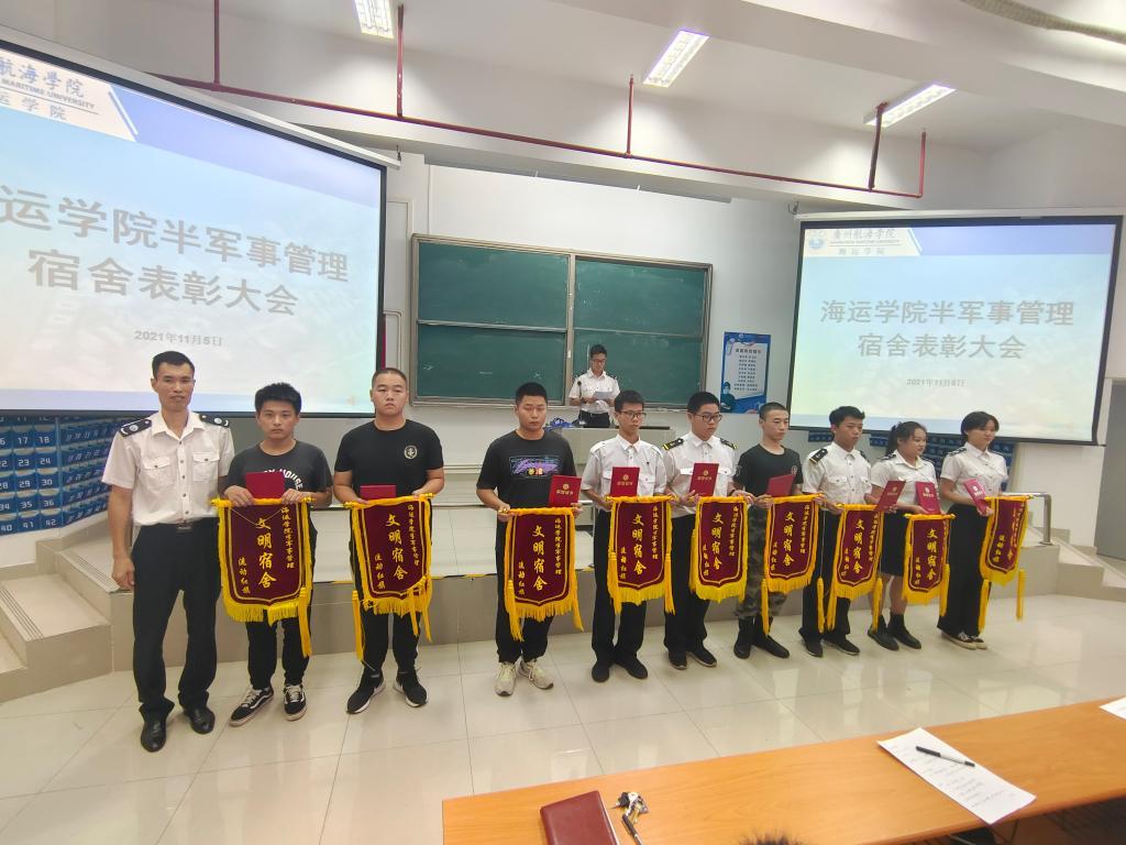 前八周内务检查的通报》,随后林少栋老师为荣获“优秀宿舍”的北四栋512等10间宿舍颁发流动红旗,吴鸿瑞老师为获得“先进个人”的航海192敖日其郎等28名同学们颁发荣誉证书和奖品,也通报批评了宿舍内务检查中总体不达标的宿舍和个人。会上,林少栋强调,宿舍卫生文化不仅是校园文化建设的一部分,更是学院开展半军事管理工作的重要组成部分,宿舍是小家,共同保持宿舍内务清洁是每个同学的义务,整洁干净的宿舍内务有利于营造良好的生活环境,有利于构建和谐的宿舍关系,有利于促进身心健康发展。希望同学们增强半军事管理意识,自觉做好宿舍内务清洁工作。