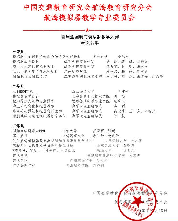 高度重视教师教学能力提升,针对航海类专业的特点,加强教师示范课程教学能力,理论与实践相融合,不断提高教学效果和水平。与来自全国航海类教师同台竞技和交流,参赛教师锻炼了教学技能,提升了教学素养,拓宽了教学理念。参赛教师将以此次比赛为契机,总结经验,奋发工作,为学校本科教学合格评估,为航海教育教学做出应有的贡献。