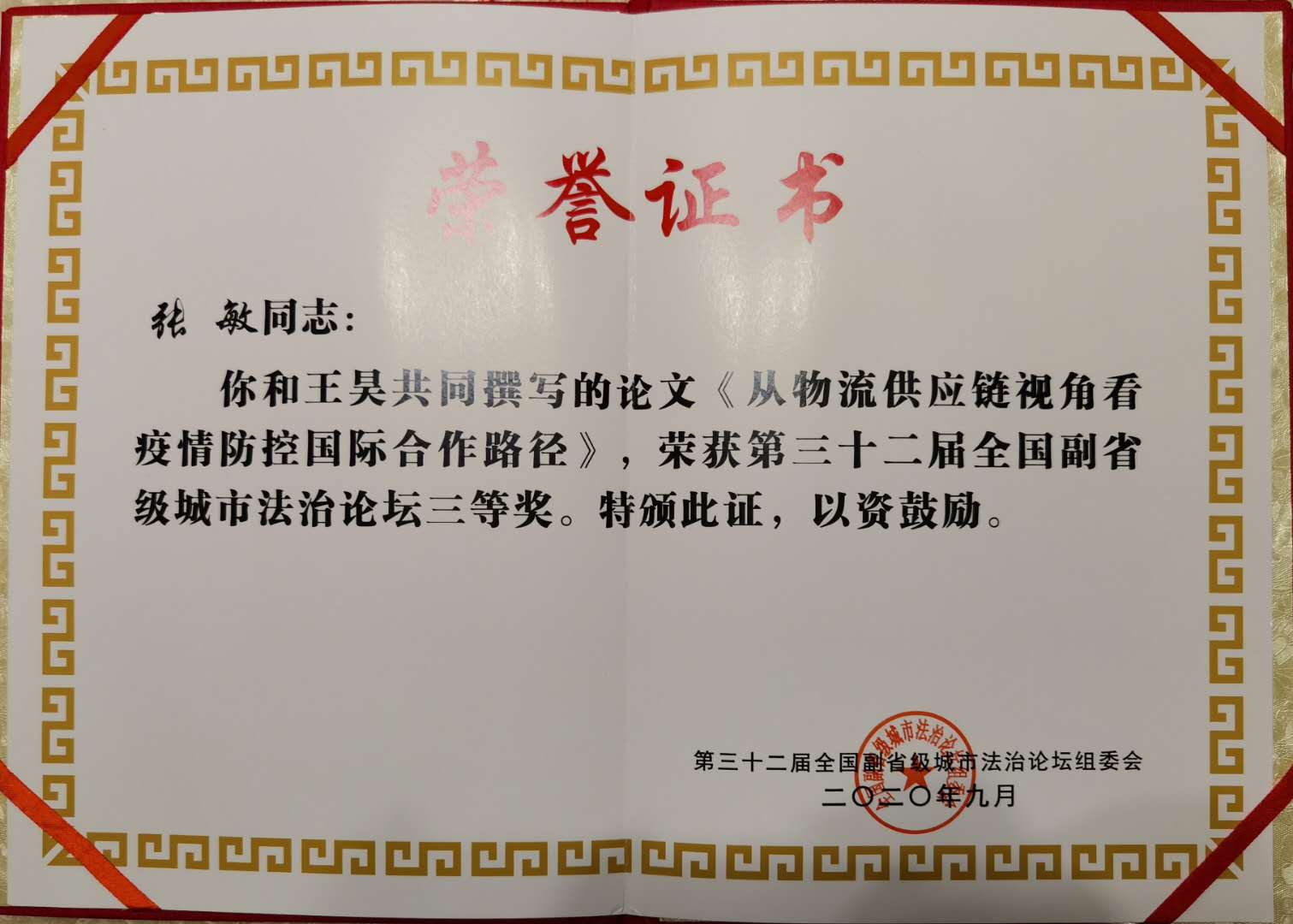 张敏老师、学报王昊老师的论文《从物流供应链视角看疫情防控国际合作路径》获三等奖。该获奖论文将被广州市法学会主编、中国法制出版社出版的《法治论坛》(CSSCI来源集刊)2020年第4辑(总第60辑)刊用。
