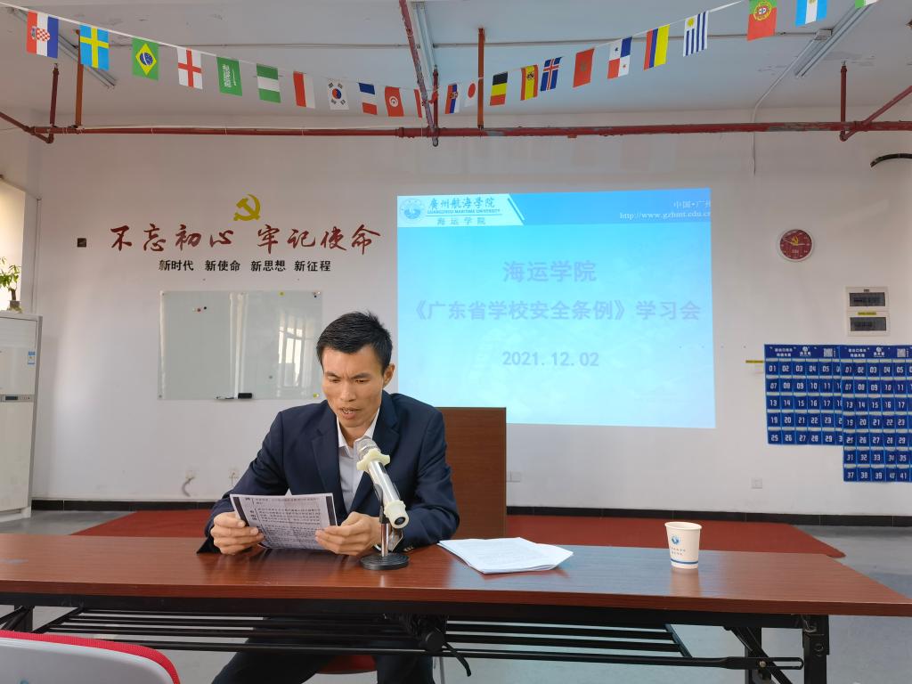 全体教职工在航海楼512会议室召开了主题学习会,全体教师认真学习了《广东省学校安全条例》,内容主要涉及校园安全管理、校外实习安全管理、安全教育与培训等多个方面,学习会由唐人街影院