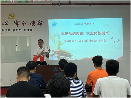 党委书记施斌在航海楼512室为航海技术21级学生讲授了主题为“牢记党的教诲,立志民族复兴”2022年秋季学期思政第一课。 施书记以“牢记党的教诲,立志民族复兴”为题,系统讲解了《习近平谈治国理政》第四卷的主要内容、核心要义。