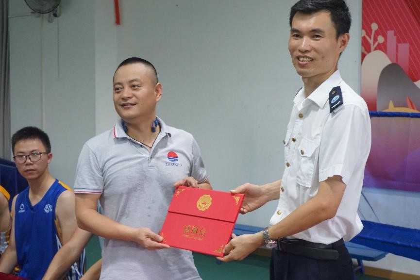 随后,在赠球仪式上,单继伟船长为运动员代表赠送了比赛用球,为比赛拉开了序幕。林少栋大队长也为公司代表赠送了感谢信和纪念品,到场嘉宾与运动员们一起合影留念。
