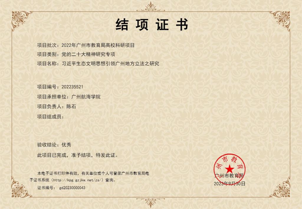 教工第二党支部书记陈石博士主持的2022年广州市教育局高校科研项目《习近平生态文明思想引领广州地方立法之研究》经教育局审核准予结项,研究成果验收结论为“优秀”。
