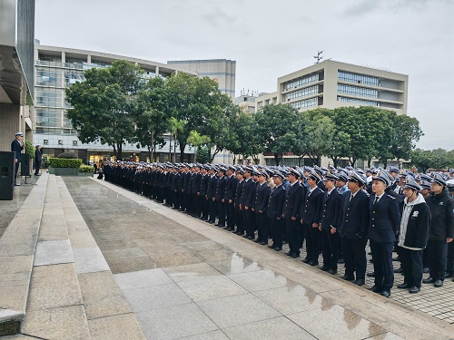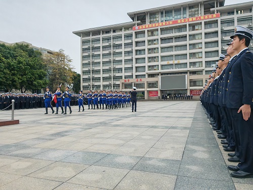 党委副书记、大队长林少栋老师首先对同学们良好的精神风貌表示肯定,并指出,每周一举行升旗仪式是我校多年来的光荣传统,是同学们爱国情、强国志、报国行的精神凝聚与情感寄托,希望同学们深入学习习近平新时代中国特色社会主义思想,严格遵守半军事管理规定,展现海运学子纪律严明、奋发向上的精神风貌。同学们要锚定新学期学习目标,刻苦学习,在学习中实现学有所思、学有所获和学有所成,在求学中激扬青春,展现青春风采。最后还对开学初诚信补考、体育竞赛活动、宿舍内务管理等进行了动员教育。