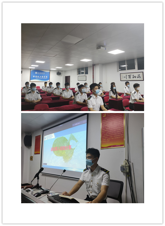 活动伊始,大家一起观看了中国军号、海政宣传局联合发布首部航母主题宣传片《深蓝!深蓝!》,感受党的十八大以来海军部队转型建设取得的巨大成就,感悟广大海军官兵勇毅前行、奋斗强军的风采风貌。随后,退役大学生代表轮机211班邹运来同学分享了他的海军经历以及生活感悟。他说,我们国家海军建设发展迅速,我有幸能加入海军是我一生的骄傲,海军经历是我终身的宝贵财富和美好记忆。他呼吁广大同学关注关心海防、国防建设。最后,赵垒老师带领大家观看了《人民海军,生日快乐》、《辽宁舰与山东舰究竟有啥区别》两个军事纪实片,并给大家讲解了中国人民解放军海军的基本情况、历史发展、海军编队等相关国防知识,并再次强调了航海类专业的国防性,号召轮机学子将个人的理想抱负与家国情怀结合起来,在新时代新征程中奋力实现自我价值与社会价值的有机统一。