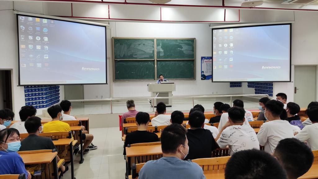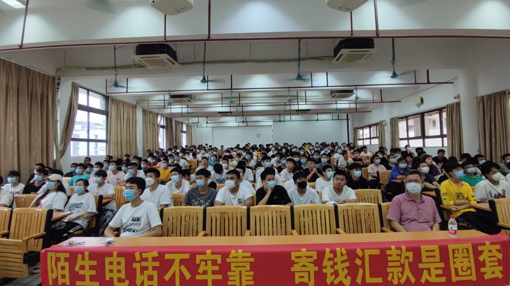 警务工作站吴清达警长,在健兵北400教室为轮机工程学院2021级全体新生开展防范电信网络诈骗宣讲会,学院党委容柏青书记,新生中队长郭世俊,2021级全体新生参加了教育活动。