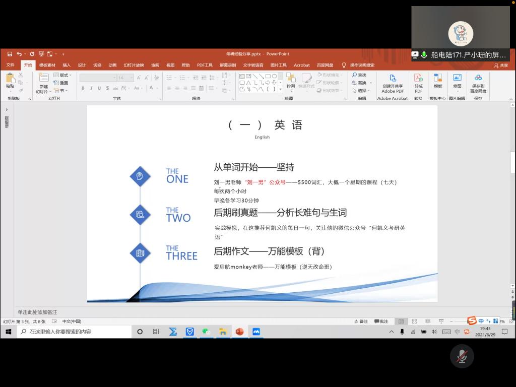 会议伊始,主持人介绍本次活动目的和4位考研党员同志的基本情况。接着,轮机172陈昊、船电陆171严小珊、轮机174戚圣琛、船电海172钱裕四位党员同志依次分享自己的考研经验,从紧锣密鼓的学习日程安排、星罗棋布的各科网站资料收集、考前心态调整、学校专业选择及考场周围租房环境安排等,师兄师姐毫无保留分享了考研的经验教训。随后,同学们热情反馈,积极询问师兄师姐有关学校选择、作息安排等具体问题,线上交流氛围浓厚。
