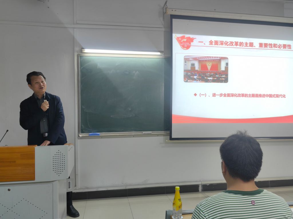 唐强荣从全面深化改革的重要性和必要性向同学们强调了党的二十届三中全会召开重要意义,带领同学们深入学习习近平总书记关于全面深化改革的一系列新思想、新观点、新论断,深刻领会和把握进一步全面深化改革要遵循的“六个坚持”的重大原则,要求同学们更加紧密的团结在以习近平同志为核心的党中央周围,锐意进取,攻坚克难,把党中央关于进一步全面深化改革的战略部署转化为汇聚中国式现代化的强大力量,奋力谱写改革开放和社会主义现代化建设伟大事业历史新篇章。