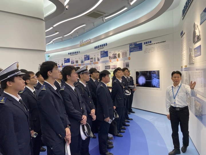 活动首站,卓越班学子抵达中远海运特种运输股份有限公司。在讲解员的带领下,大家回顾了中国远洋海运集团的发展历程,从筹建初期到拥有第一艘远洋轮船“光华轮”,再到如今规模和综合实力位居世界前列的运输船队。通过对集团辉煌历史的了解,学生们深刻认识到航运事业在实现中华民族伟大复兴中的重要作用,增强了在新时代航运事业中挺膺担当的历史使命感和责任感。