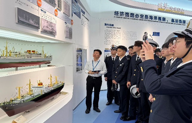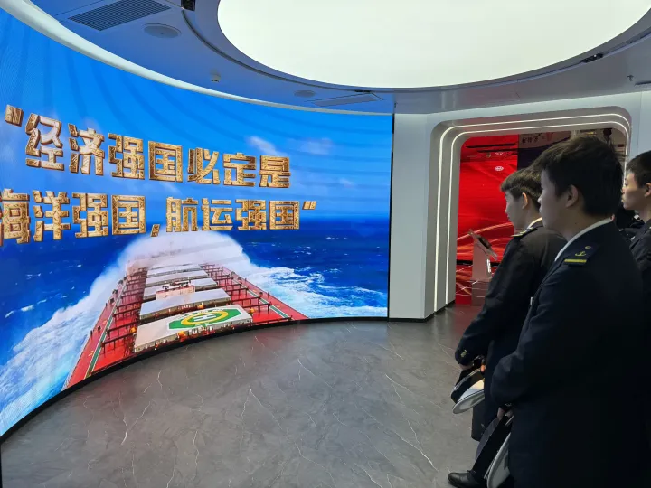 在参观中远海运散货运输有限公司时,同学们了解其作为全球规模最大的专业化散装货物运输企业,拥有各类散货船超500艘,超5100万载重吨,装载铁矿石、煤炭、粮食、散杂货等全品类散装货物,航线覆盖国内沿海和世界主要港口,服务网络遍布全球。在讲解员的介绍下,同学们学习了“桃花山轮”抗击海啸的事迹,认识到优秀海员不仅需要扎实的专业技能,更需要坚定的意志和面对挑战的勇气。